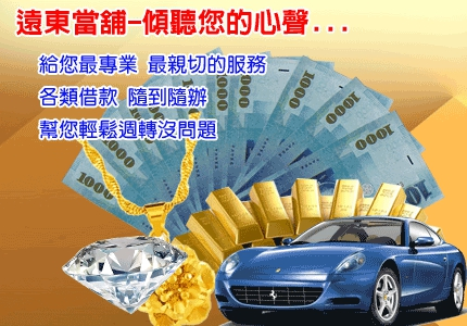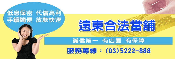 遠東當舖-專業 真誠 用心服務,解決各行各業在資金週轉上的煩惱!不管個人小額借貸、公司 / 工廠 / 機器大額融資、生意人的臨時週轉金,都是以滿足客戶需 求為優先考量,在業界也絕對是服務第一 品質第一,給消費者一個安全合法的借貸管道。